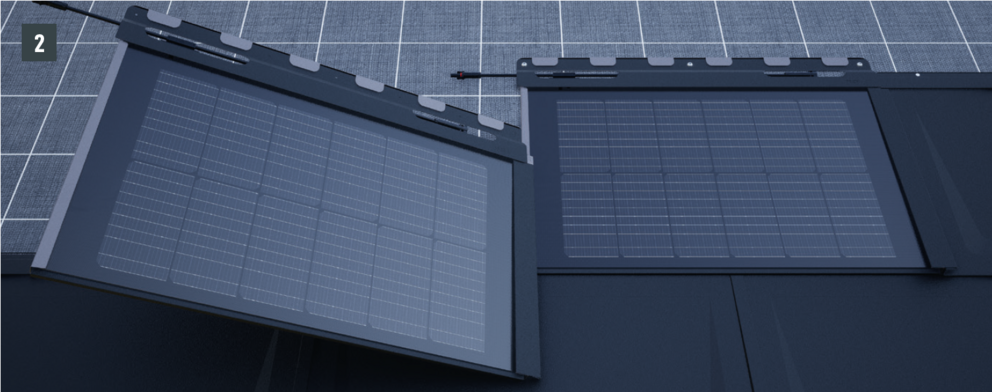 • Schräges Einhängen der nächsten Solardachplatte in das untere Drittel des konischen Falzes der vorherigen Platte (Bild 2)