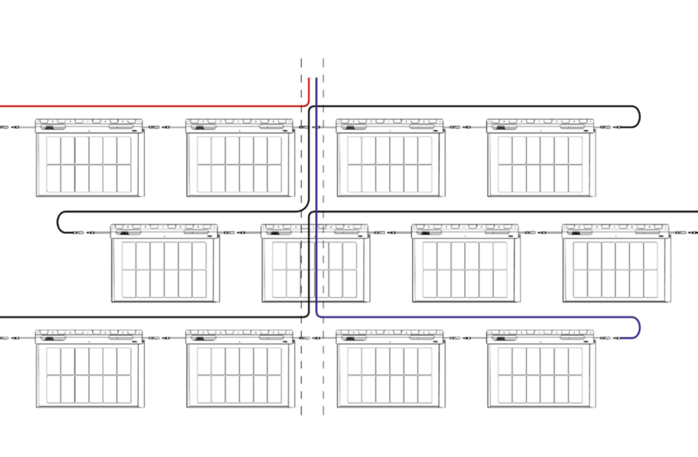 Eine PREFA Solardachplatten-Anlage benötigt je Strang eine Zu- und eine Ableitung. Darüber hinaus müssen die Dachplattenreihen untereinander mit sogenannten Verbindungsleitungen verbunden werden.