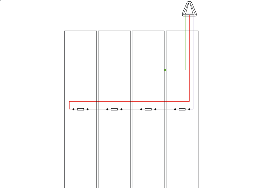 Eine PREFALZ Solarmodul-Anlage benötigt je Strang eine Zu- und eine Ableitung. In der folgenden schematischen Skizze der Verkabelung sind zum leichteren Verständnis die Zuleitung in Blau, die Ableitung in Rot, der Potentialausgleich in Grün, sowie die Modulleitungen in Schwarz dargestellt.