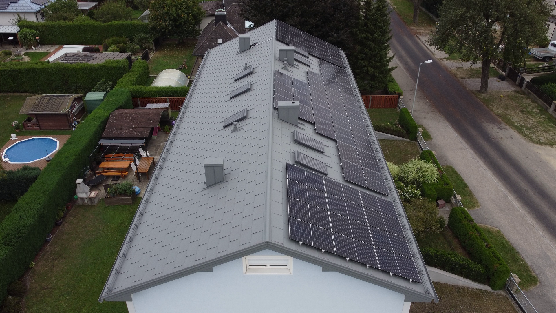 Im Zuge dieser Sanierung wurden somit über 350 m² Dachfläche, sieben Dachflächenfenstereinfassungen, vier Kamineinfassungen und sieben Strangentlüftungen fachgerecht erneuert. Zusätzlich wurde auf dem Dach eine PV-Aufdach-Photovoltaikanlage installiert.