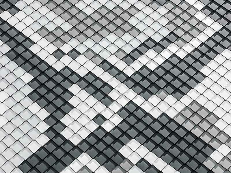 „Wir hatten eine genaue Zeichnung der nachgestellten Schlangenhaut vom Architekten erhalten. Mit der Info, wo welches Fassadenelement seinen Platz finden soll“, erinnert sich Gaide. Raute für Raute waren für den Effekt der schillernden Außenhaut genau festgelegt. Deshalb wurde auf jedem Kleinteil in der entsprechenden Farbe P.10 anthrazit, P.10 hellgrau, naturblank sowie silbermetallic eine Nummer notiert, die bei der präzisen Umsetzung der Anordnung vom Plan auf die Fassade half.