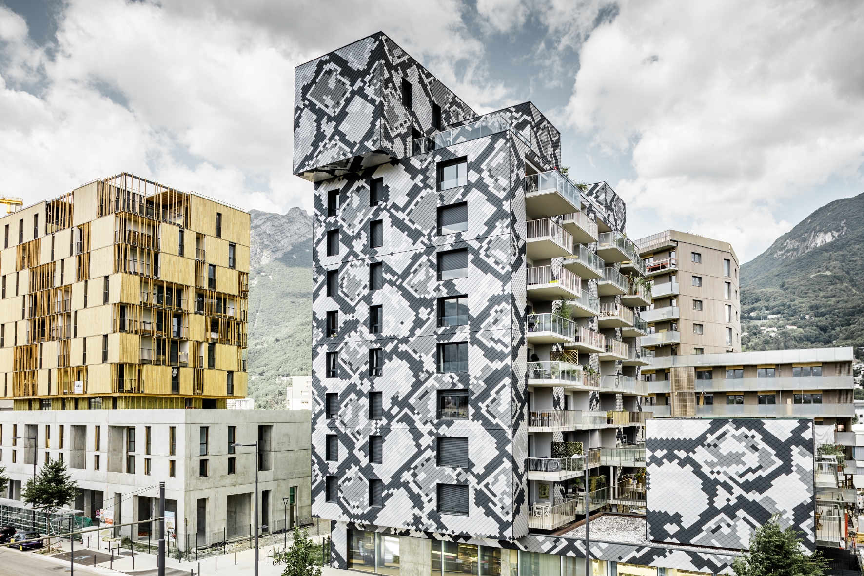 47.000 PREFA Wandrauten in vier unterschiedlichen Farben machen aus einem, an sich schlichten, Wohngebäude eines prominenten französischen Architekten einen optischen Meilenstein. Das „Schlangenhaus“ mit seiner auffälligen Python-Fassade ist faszinierender Blickfang eines architektonisch eher pragmatisch angelegten neuen Stadtteils von Grenoble.