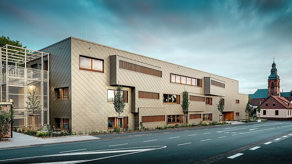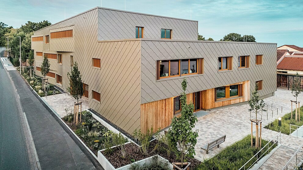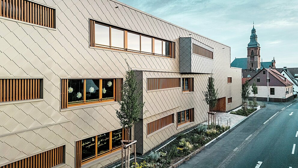 Den bronzefarbenen Aluminiummantel legte die Spenglerei ASA Schüßler um das Gebäude. Das fränkische Traditionsunternehmen hat bereits das zweite PREFARENZEN Projekt in Alzenau erfolgreich umgesetzt. Für das Hybridgebäude wurden etwa 3.500 der 44 × 44 Zentimeter großen PREFA Wandrauten in Bronze montiert – jede einzeln verdeckt mit PREFA Rillennägeln auf die hölzerne Vollschalung angebracht. Die zahlreichen Gebäudeecken und Leibungen sind mit Taschenprofilen und Standard-Eckwinkeln besetzt.