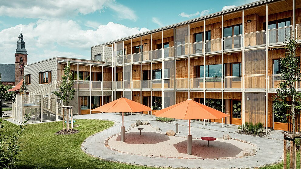 Die neue Kindertagesstätte sollte aber nicht nur den Jüngsten bedarfsgerechten Begegnungsraum bieten, sondern auch adäquaten Wohnraum für die Mitarbeitenden des nahegelegenen Klinikums. „Wir finden es gut, wenn mehrere Funktionen kombiniert werden, aber oft erweisen sich Förderlogiken, Vergabeverfahren und die Erwartungshaltung kommunaler Entscheidungsträger als beharrliche Herausforderungen“, so Theo und Claudia Härtner. Eine Challenge wie gemacht für das Architektenpaar, denn sie sind nicht nur auf den Neubau von Kitas, Grundschulen und Lerninstitutionen spezialisiert, sondern auch auf lösungsorientierten Dialog und Diskurs mit den Verantwortlichen.