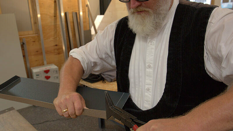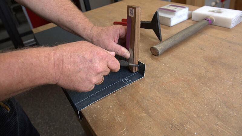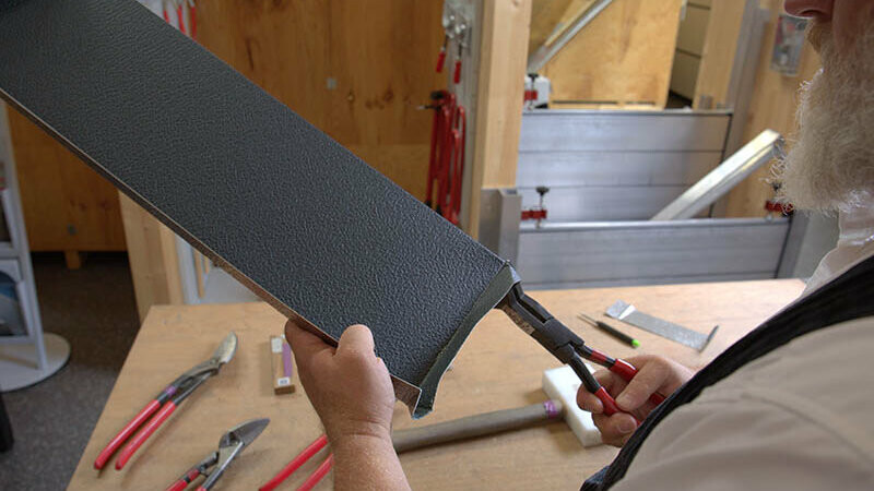 Nach dem winkelrechten Anreißen der Falzlinien ist beim seitlichen Aufkanten mit der Quetschfalzzange der erste Schritt der Entscheidende. Der Rest ergibt sich von selbst. Mit dem Kunststoffhammer kann man an den geschlossenen Fälzen noch etwas „Kosmetik“ betreiben. Durch die geschlossene Quetschfalte gilt das Fensterblech als schlagregendicht. Zur Montage wird es wegen der Längenausdehnung am Anschraubsteg mit Langlöchern versehen und mit Fensterbankschrauben und Kunststoffunterlegscheiben befestigt.