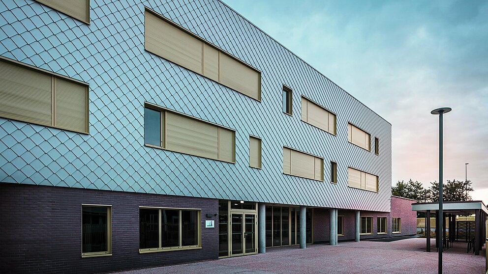 Bei CLARC haben alle Entscheidungen auch eine pragmatische Seite. Der Klinker im Erdgeschoss ist robust genug für den Schulalltag, in dem Bälle oder Schultaschen schon einmal an die Wand prallen. Das Aluminium darüber reflektiert das Licht und lässt das Gebäude fast schwebend wirken. Auch die Farbwahl folgt keinem modischen Trend, da das Schulgebäude über Jahrzehnte hinweg funktionieren muss.