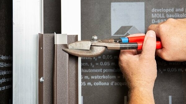 Müssen die Profile gestoßen werden, kann die Sicherung gegen Abrutschen entweder durch einen verdeckten Niet oder durch einen kleinen Schnitt mit der Blechschere im Überlappungsbereich erfolgen. Die Profile selbst erhalten Sie als Zubehör bei PREFA oder das passende Ergänzungsblech zum bauseitigen Kanten.