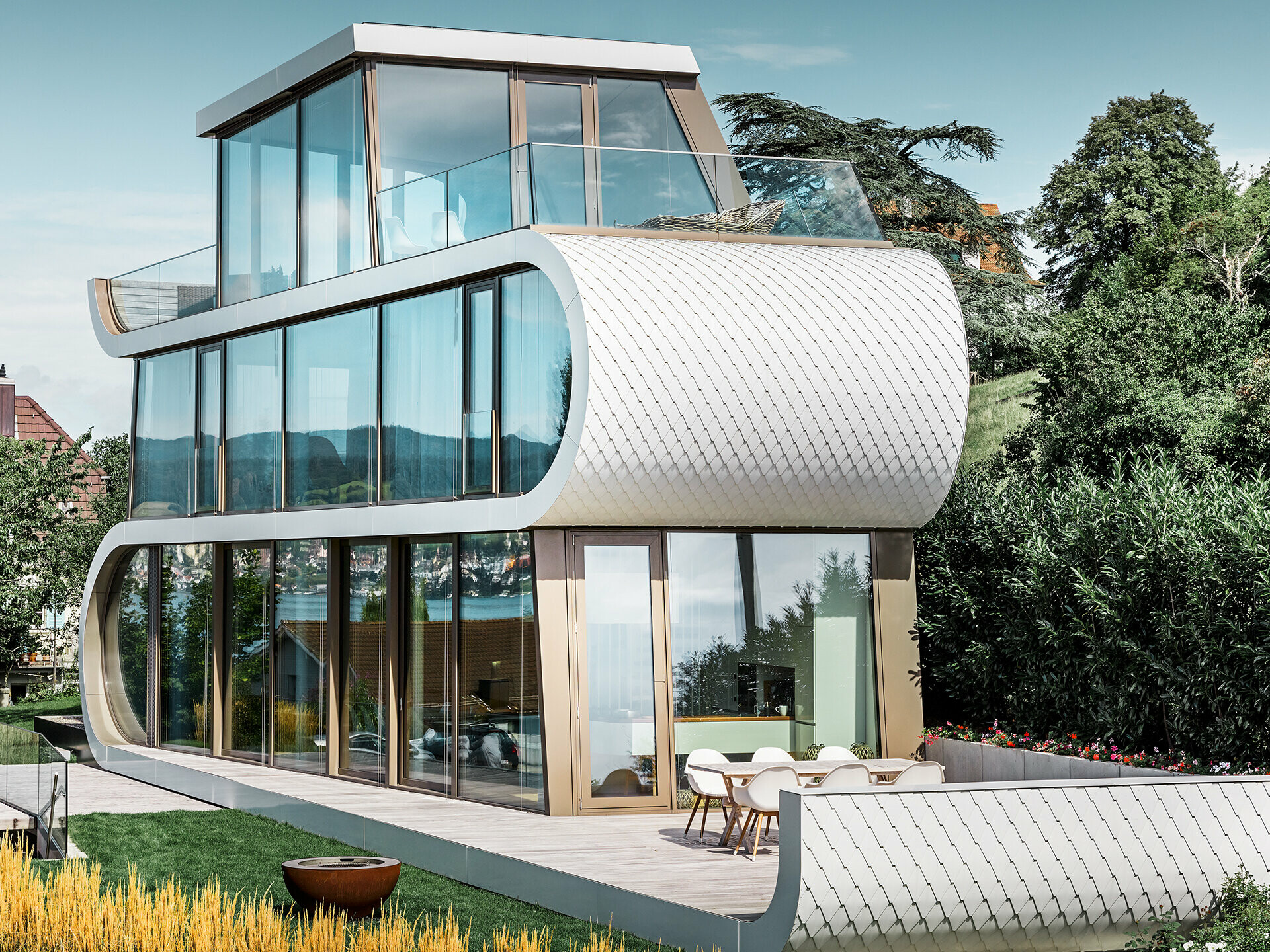 Die Vorderseite des Hauses besticht durch eine Glasfront. An den Rundungen sind kleinteilige, reinweiße PREFA Schindeln zu sehen, die wie eine Art Polsterbezug wirken. „Weil diese Bögen eine ganz starke Kraft vermitteln, war es uns wichtig, eine Verkleidung zu finden, die diese Bewegung aufnimmt und auch farblich optisch fortsetzt“, erzählt Camenzind, der nach vielen Materialtests immer wieder auf den Gedanken von alten Kirchturm-Holzschindeln zurückkam, die für ihn Textur und Weichheit repräsentieren.