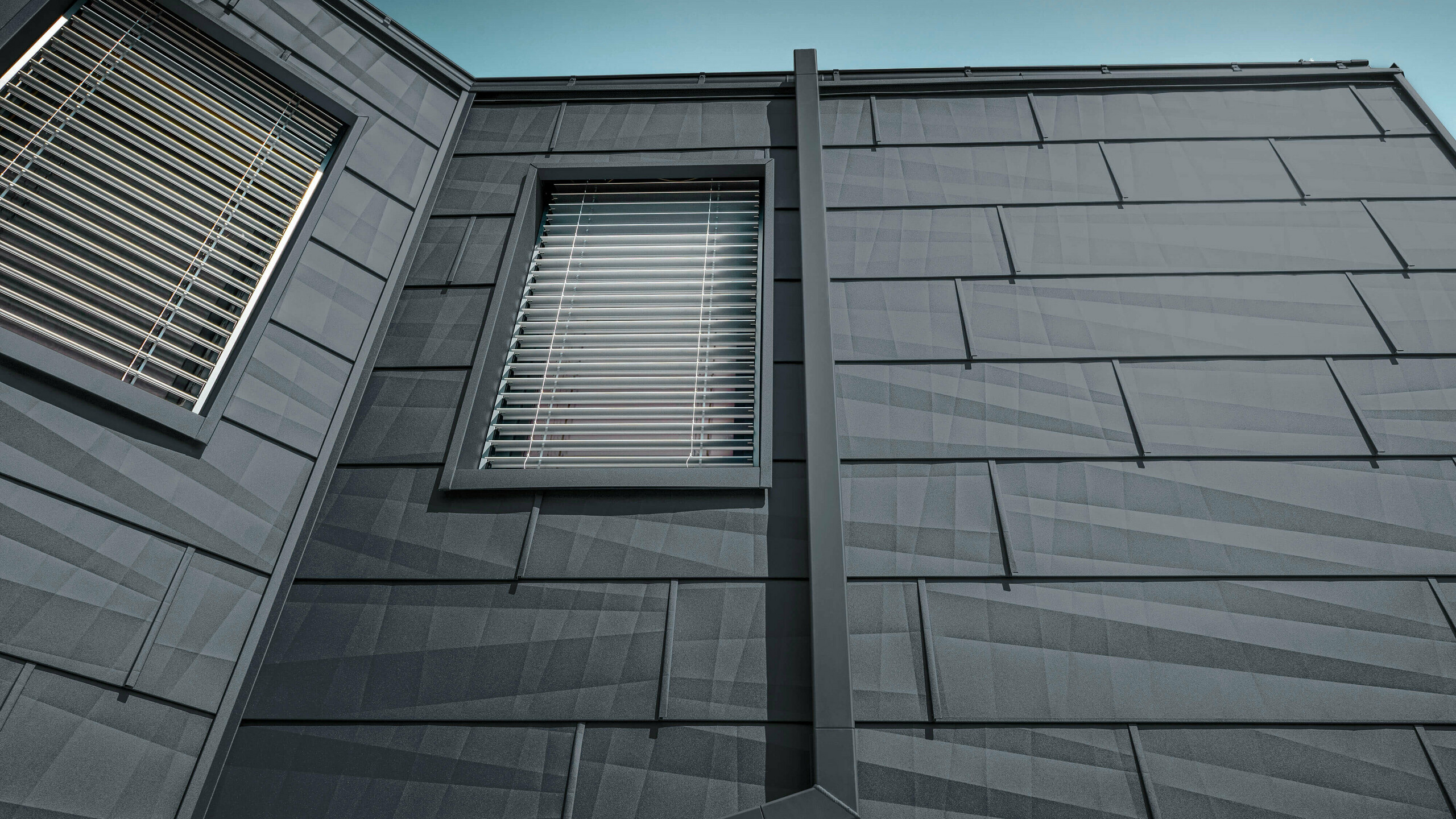 Die PREFA Wandraute 44 × 44: Die Rautenform verleiht der bewährten Schuppenoptik beeindruckende Akzente und ist besonders rasch verlegt.