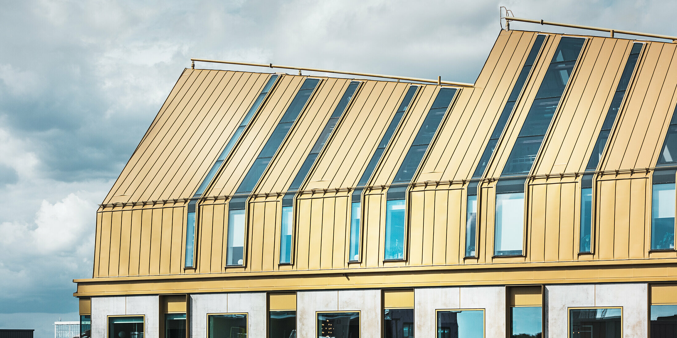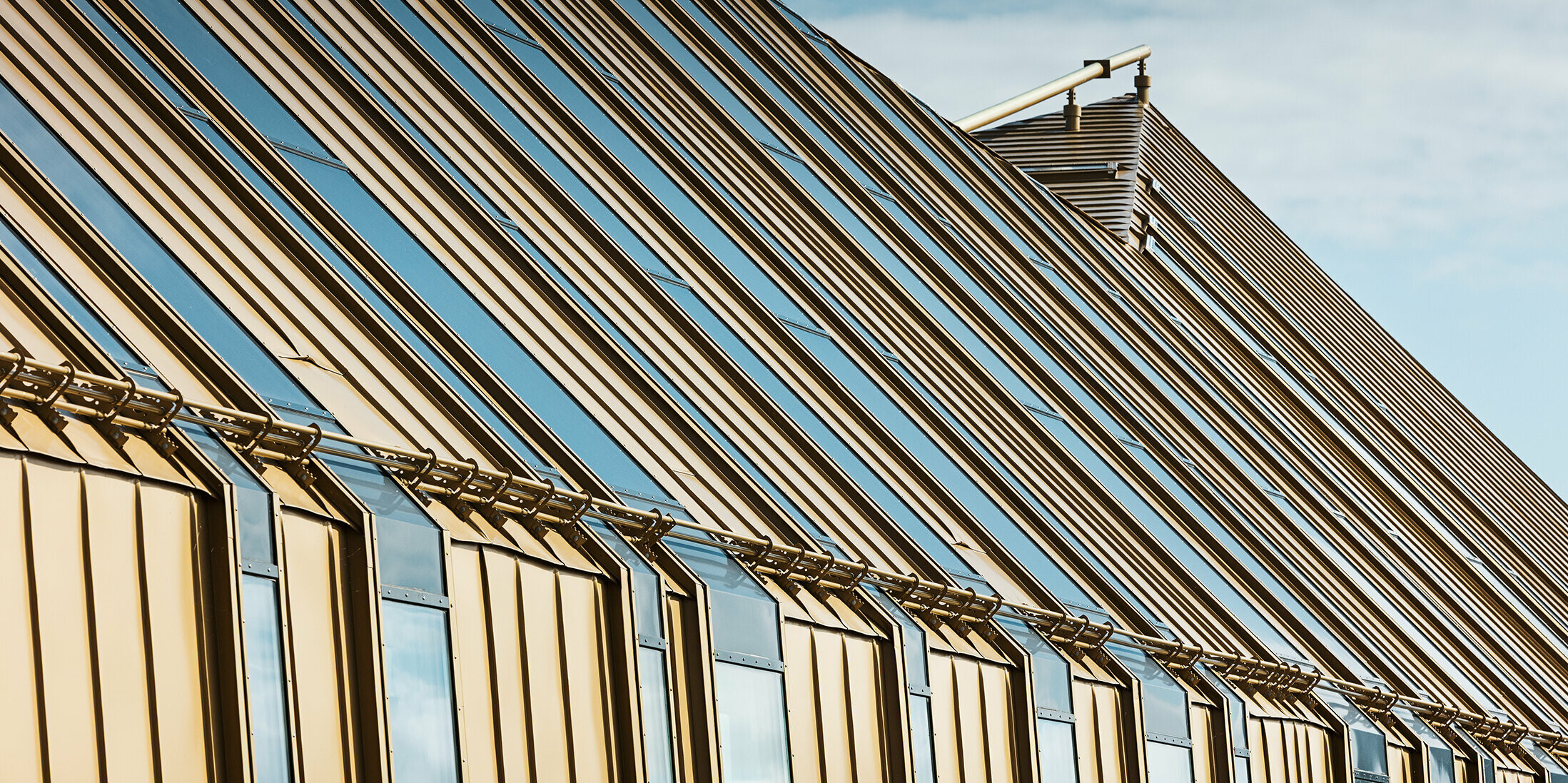 Die tragende Stahlkonstruktion des Dachs ist mit 2.000 m² PREFALZ eingedeckt, deren Beschichtung eine Spezialanfertigung von PREFA ist. Die neu entwickelte Sonderfarbe heißt Gold Jaisalmer-2525, benannt nach der indischen Wüstenstadt Jaisalmer, deren Ruf als goldene Stadt Vorbild für die schimmernde Farbe der Beschichtung war.