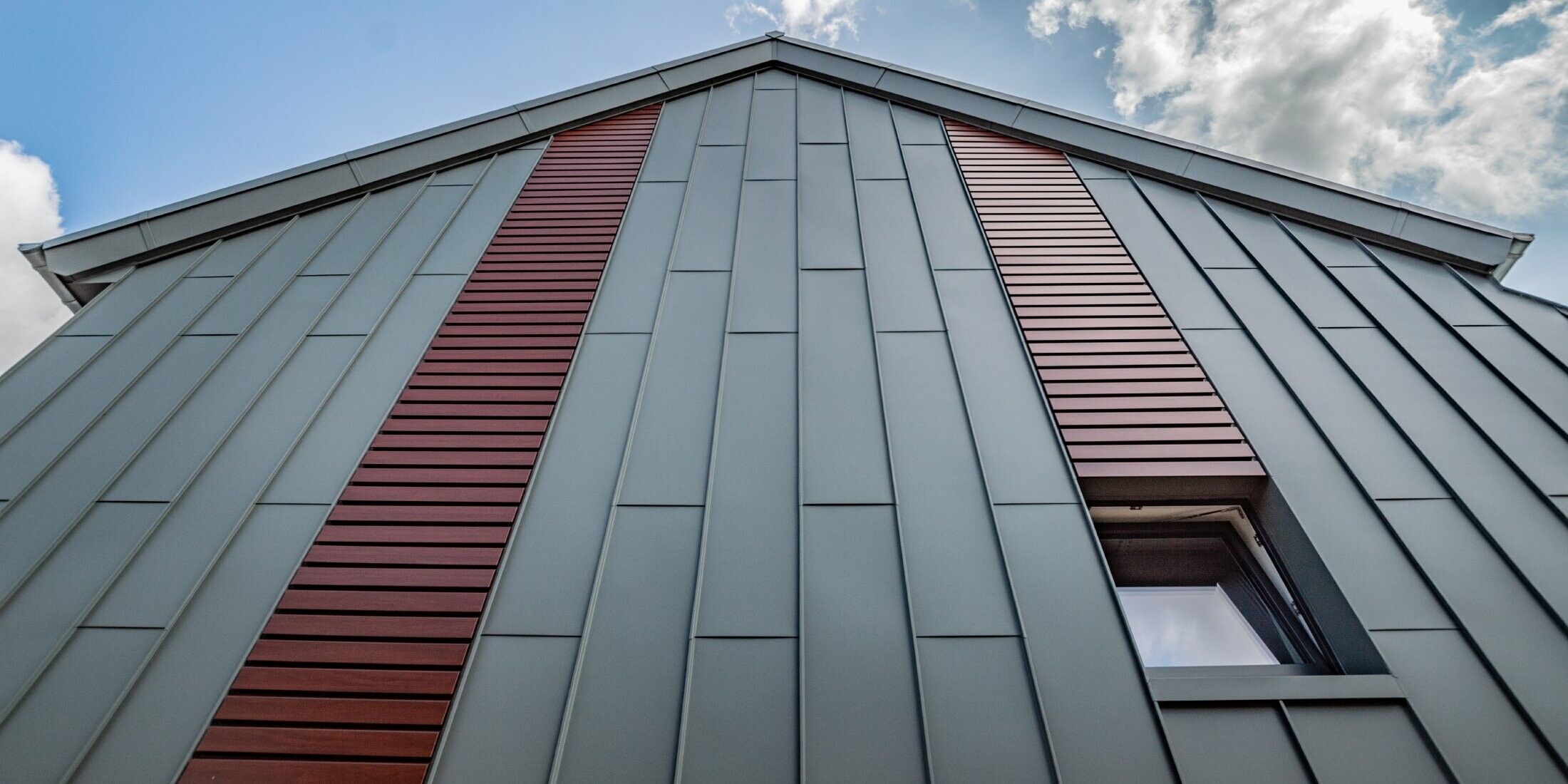 Die Fassade des Einfamilienhauses wurde mit PREFALZ in P.10 Hellgrau (senkrecht verlegt) und Siding-Elementen in Holz dunkel (vertikal verlegt) verkleidet.