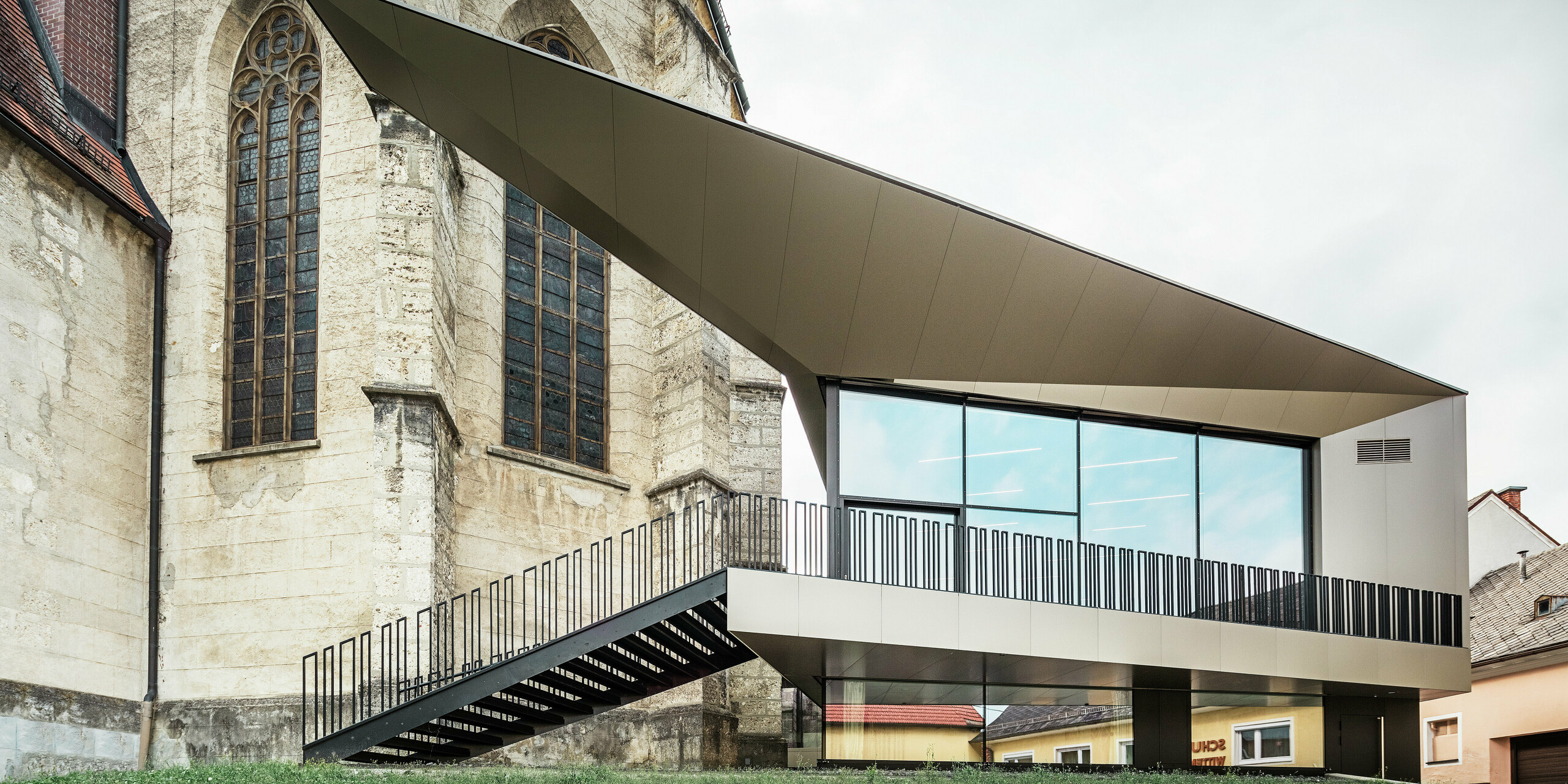 Die Dachdraufsicht mit innenliegender Folien-Regenrinne und flacher Neigung aus bronzefarbenem PREFALZ verbindet sich optisch mit den PREFABOND Aluminium Verbundplatten der Fassaden. Die Farbe der Fassade ähnelt dem Sandstein der teils hochgotischen Kirche. Sie wird im Innenraum durch Wandsteine aus Konglomerat komplettiert.