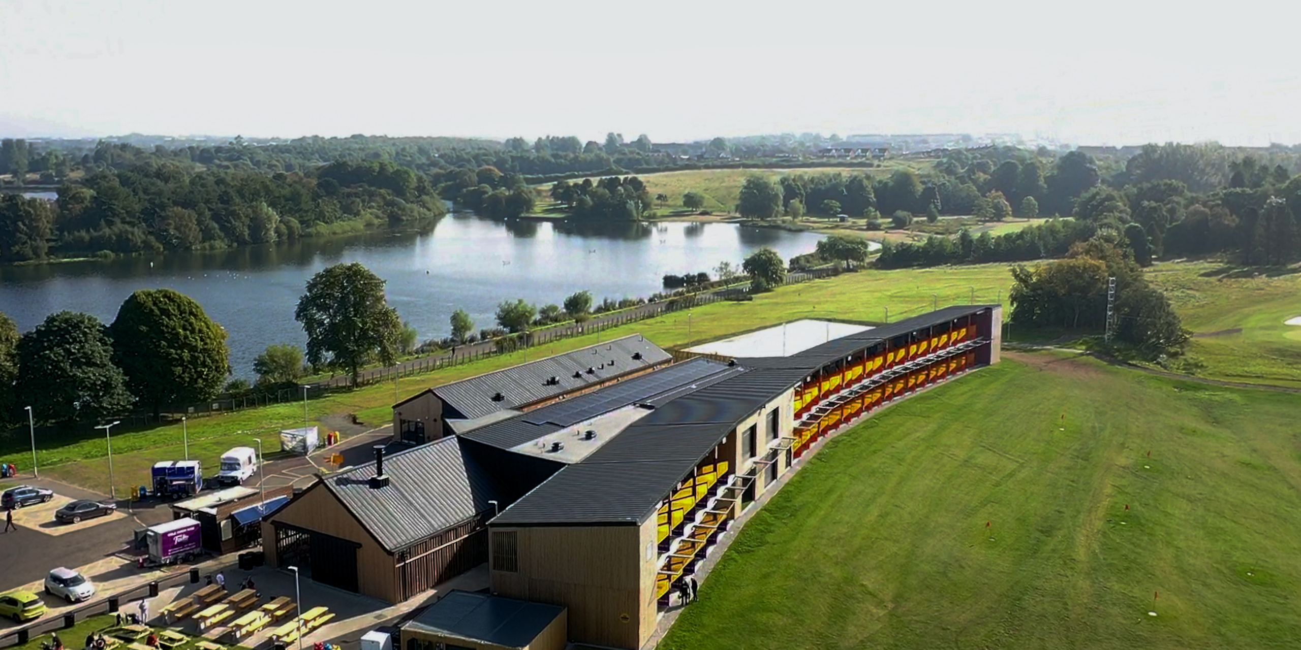 Die Golfanlage "Golf it!" in Glasgow, Schottland, besticht durch seine moderne Architektur inmitten einer gepflegten Landschaftskulisse.