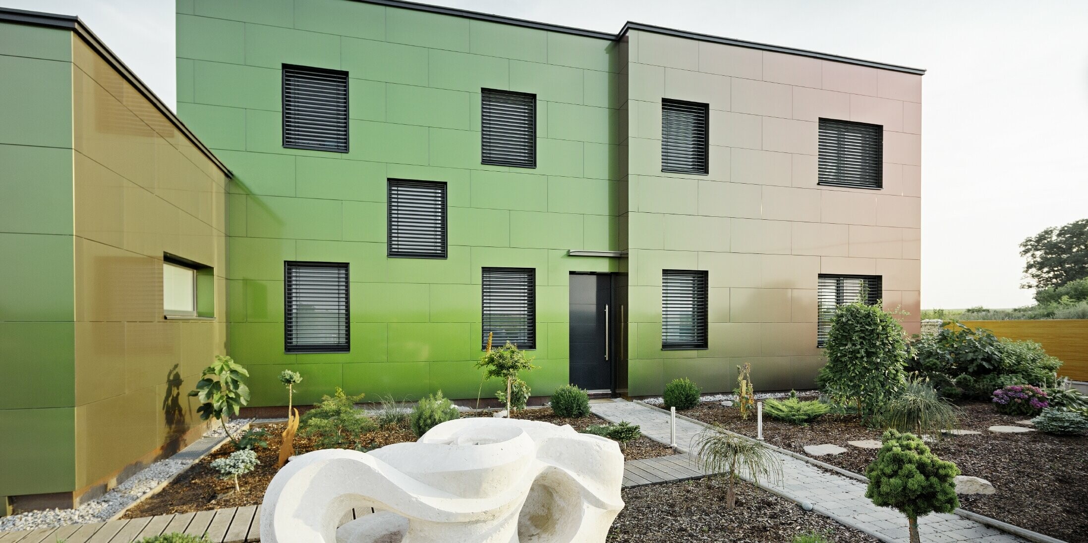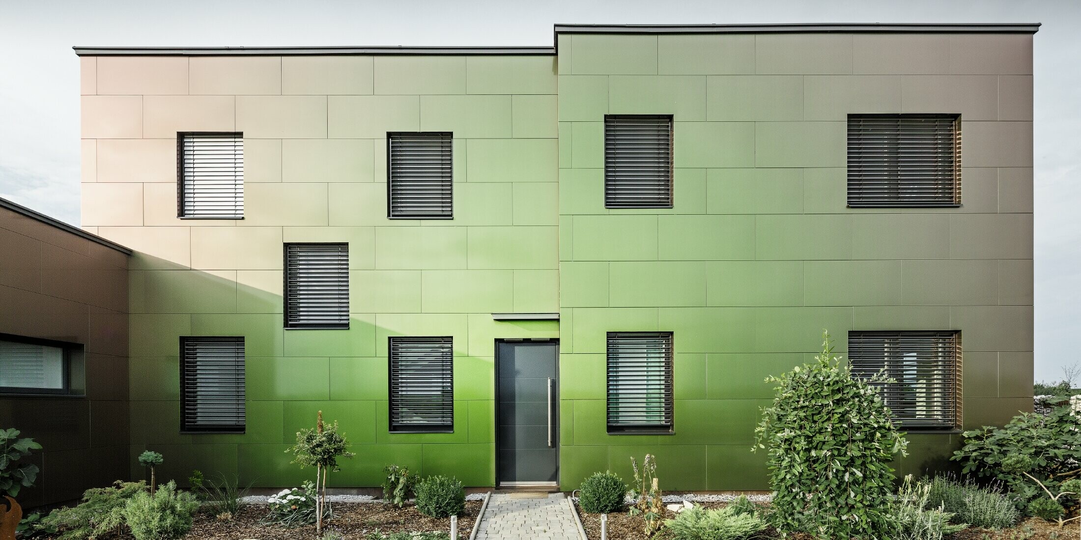 Familie Pollak wollte bei Ihrem Wohnhaus bewusst auf mutige Farben setzen. Mit der PREFA Aluminium Verbundplatte in Chamäleon, Spring Lake, haben Sie das definitiv geschafft. Für die zuverlässige Dachentwässerung wurde das eckige Ablaufrohr, das PREFA Quadratrohr, in Anthrazit gewählt.