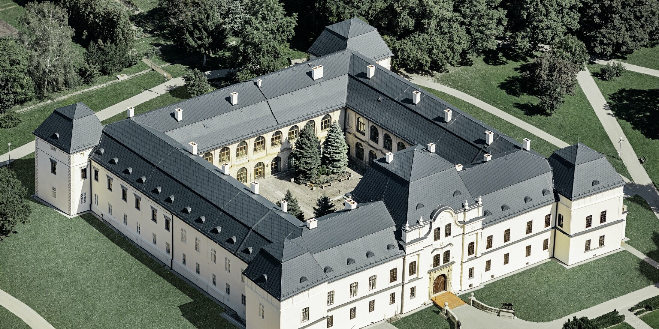 Ein neues Dach für ein Herrschaftsgebäude - das Schloss Humenné wurde im 17. Jahrhundert im Stil der Renaissance gebaut. Nach dem Zweiten Weltkrieg wurde es zerstört und in den 60er-Jahren neu aufgebaut. Nun, Jahre später, war es an der Zeit, das für die Stadt so wichtige Bauwerk zu sanieren und das bereits schadhafte Dach neu zu decken. Die Farbe der PREFA Dachrauten 29 × 29 und des passenden Zubehörs in Anthrazit soll dabei an historische Eisenelemente erinnern.