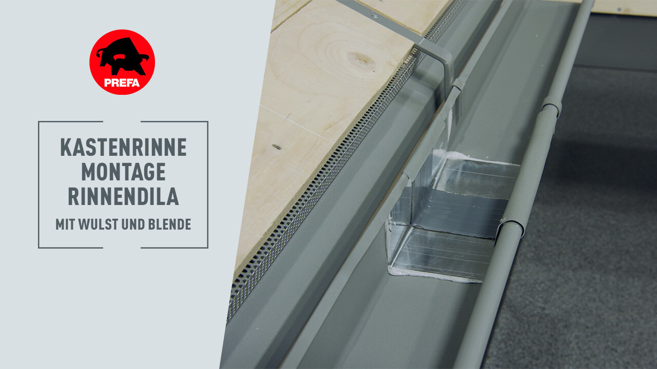 In diesem Video wird die Montage der Rinnendila mit Wulst und Blende bei einer PREFA Kastenrinne gezeigt.
